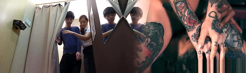 Asian Pussy Life Insurance: Two Women and a Man on a Red Couch